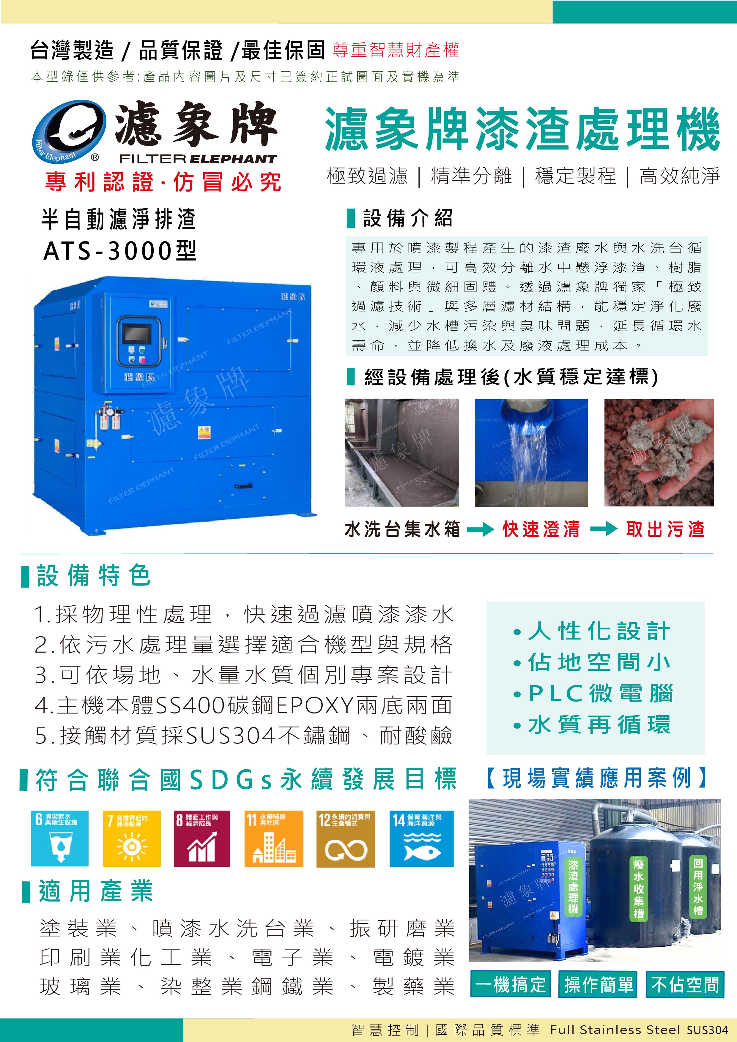 漆渣處理機專為水簾幕、水洗式噴漆作業區所產生的噴漆廢水設計,能快速分離水體中的污渣,提升水體可回收再利用的清澈度,延長循環用水壽命,並降低污泥量與處理成本。
