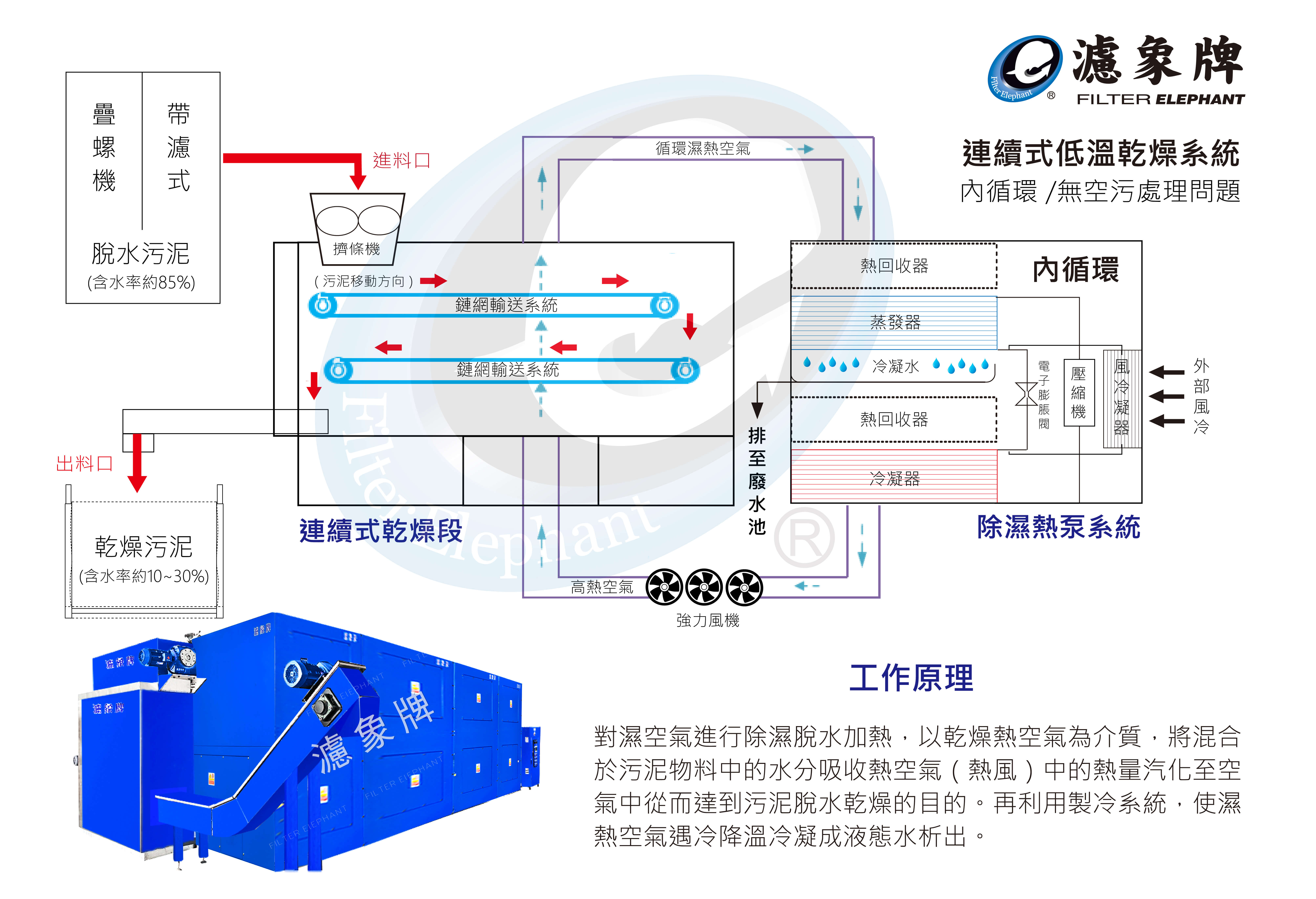 | 能源回收利用 | 利用熱能內循環乾燥設計,節省能源消耗,且無空污問題,達到高效率與低碳排放,提升企業ESG。 |
