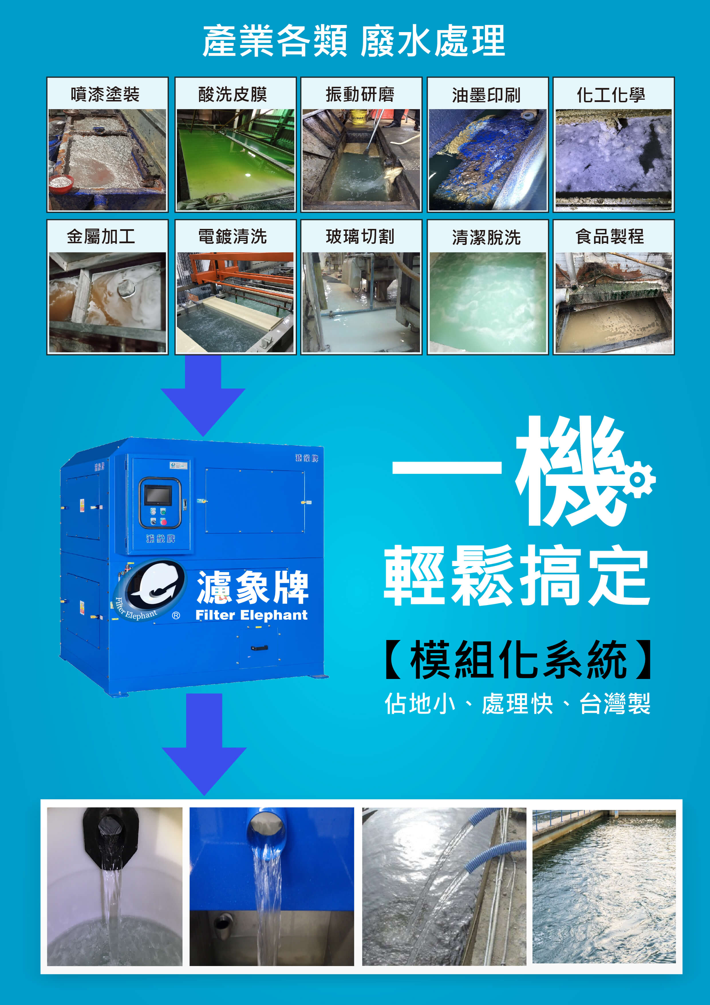 現今的污水處理工藝當中,濾象牌具備多年水質處理經驗,並深度了解水的習性與特性,從而研發 推出的小型廢水套裝設備,將複 雜化的流程濃縮在系統建置,達到人性自動化、設備占地簡約化, 將不必要的配置取而代之,從最精簡的架構達到最大的處理效能 把最實際的價格回饋給各企業, 「濾象牌」能依客戶的水質作採樣實驗,找出水質中最有效的處理方法,包括不同場案、水量大小 濃度高低,搭配自家獨有的全自動化污水處理系統,以客製化的空間設計與台灣製的品質規格, 從採樣→實驗→規劃→設計→製造 到最後的售後服務,以一條龍的方式建立與顧客的全球服務性 達到各大企業成功減廢是我們的目標。