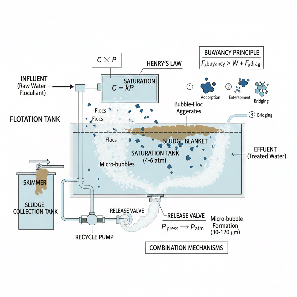 溶氣 → 微氣泡 → 上浮 → 刮除